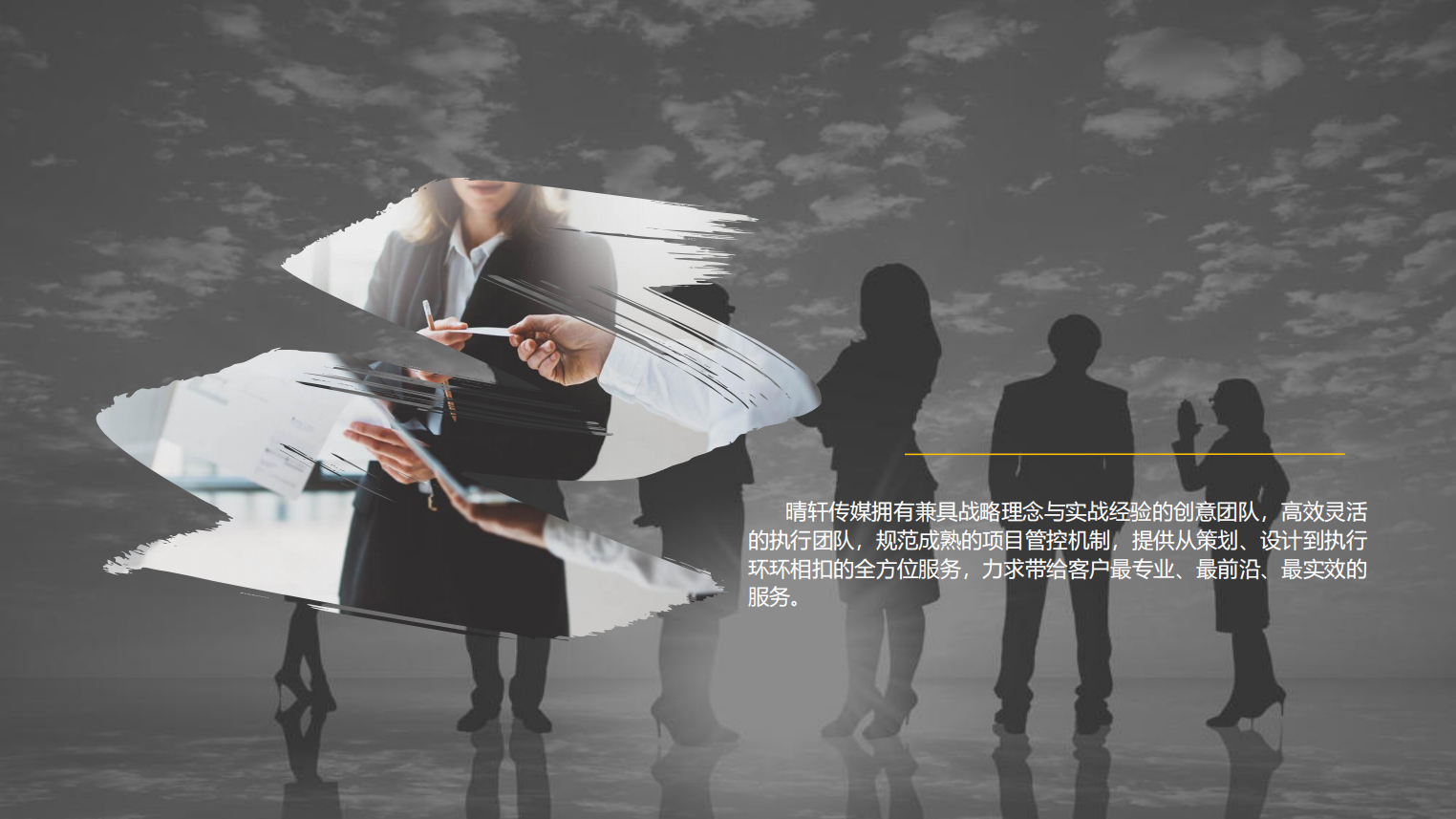 河(hé)北(běi)晴軒文(wén)化(huà)傳媒公司集“網絡營銷γ←、活動策劃、信息咨詢、企業(yè)形象策劃、營銷策ε↔劃、廣告代理(lǐ)、廣告創意、媒體(tǐ)代理(lǐ)、市(shì)場(ch∏≥∞☆ǎng)調研、品牌策劃、平面廣告制(zhì)作(zuò)、公€β關方案、行(xíng)銷推廣、咨詢顧問(wèn)”等等企業(yè)文(£↔≈ wén)化(huà)體(tǐ)系于一(yī)體(tπγǐ),以簡潔高(gāo)效的(de)管理(lǐ)架構,依托團↔♥δ結務實的(de)優秀團隊,憑借強大(dà)的(de)外(wài)協♥εσ平台,具備獨立承接大(dà)型營銷策劃全案和(hé)各種會(huì)展的(deφ↕)能(néng)力,為(wèi)各種行(xíng)業(yè)提供全方位服務。Ω©